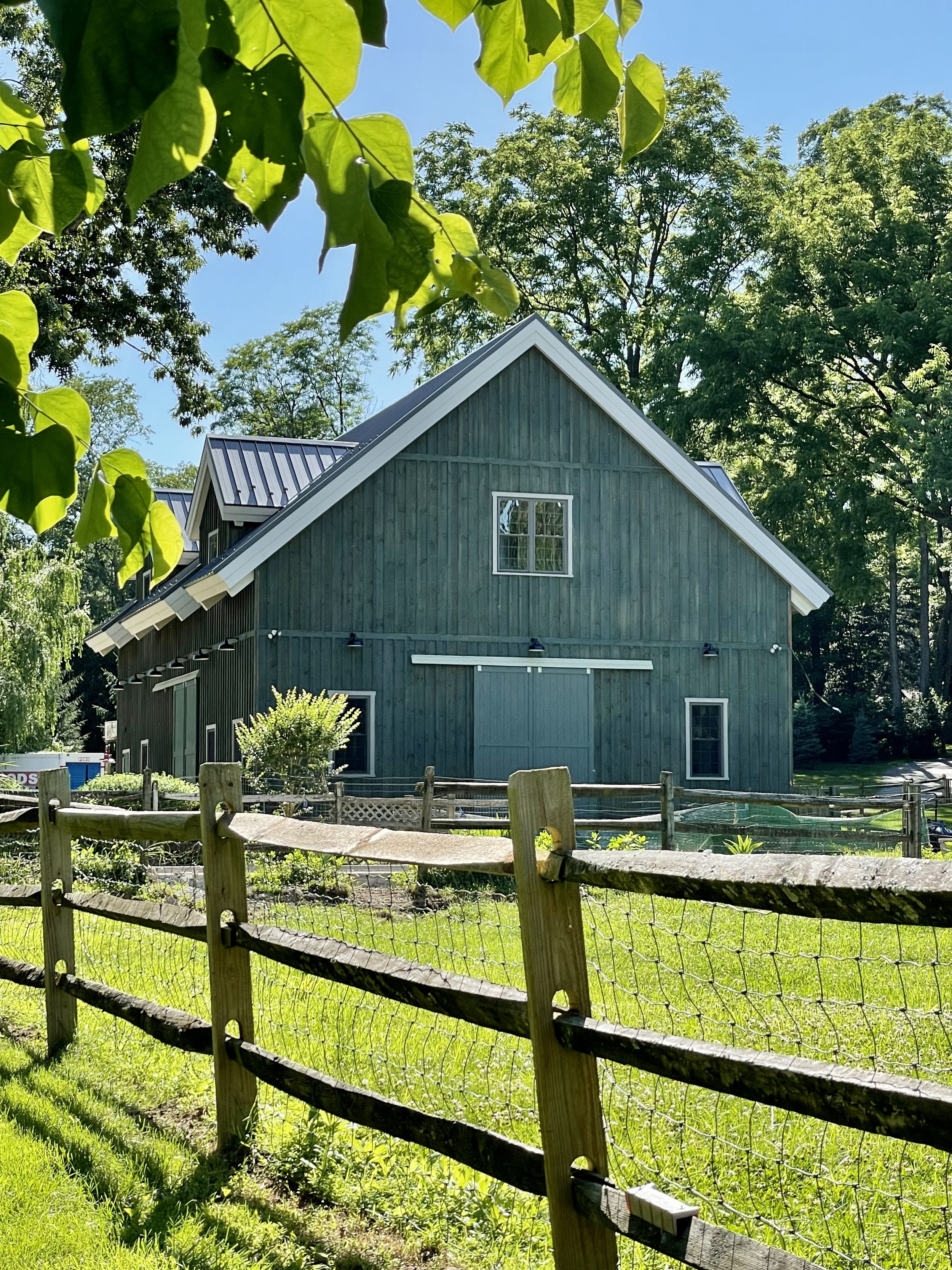 In 2020, just before the COVID pandemic, we tore down the old barn and started construction on a new barn, shipped from Nebraska by Sand Creek Post and Beam (now Timberlyne Group). The building arrived on December 7th on seven tractor trailers. Victor Burgos and Sons were the general contractors; Erin Cochran of Revealing Redesign provided design expertise; the Amish crew of Jake Immergut completed the framing, siding, and roof; John McClenahan of McClenahan Painting gave the barn its beautiful hue of moss green and Kevin Meyers of Brooksmeyer Landscaping provided grading and hardscape construction. It was a thrilling scene to see the first posts and beams go up.